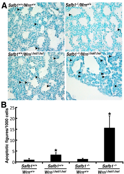 Figure 3. Apoptotic figures in the lung tissues from 19 days old mutant embryos. (A) Apoptotic cells detection (TUNEL) assay on 19 days post-coitum embryonic lung sections showing a major increase in the number of apoptotic cells in Safb1-null/WrnΔhel/Δhel (or Safb1−/−/WrnΔhel/Δhel) embryos compared to the other genotypes. Healthy cells are stained in green (methyl green staining) and apoptotic cells are dark blue. Arrowheads point to representative apoptotic cells. Magnification 400X. (B) Average number of apoptotic figures per area of lung sections containing 1000 cells (n=3 embryos for each genotype; *: unpaired student t−test P-value < 0.05 compared to wild type Safb1+/+/Wrn+/+ animals).