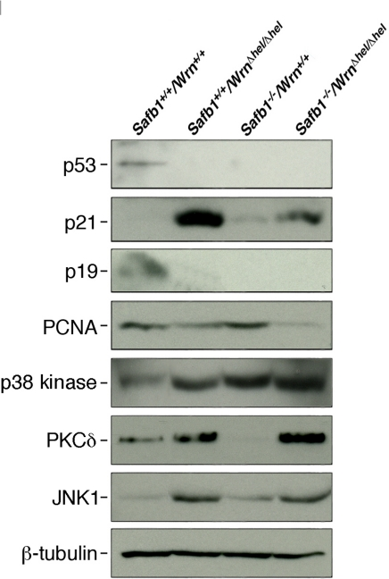 Figure 8. Protein levels of p53, p21Waf1, p19Arf, PCNA, p38 kinase, PKCδ, and JNK1 in MEFs. Whole cell lysates from MEFs of each genotype were analyzed by immunoblotting with antibodies against the indicated proteins. Proteins were extracted from wild type, WrnΔhel/Δhel, Safb1-null, and Safb1-null/WrnΔhel/Δhel MEFs. β-tubulin was used as a loading control.