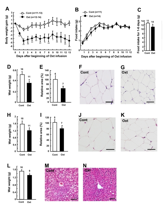 Figure 3. Chronic Oxt infusion decreases body weight, food intake and visceral fat mass. (A, B) Body weight gain (A) and daily food intake (B) after implantation of Oxt (1,600 μg/kg/day) infusion minipump. (C) Cumulative food intake for day 1 through day 6 is calculated from Fig. 3B. (D-G) Wet weights (D) and relative areas (E) of mesenteric fat in control and Oxt infused mice. Microphotographs of mesenteric fat in control (F) and Oxt infused (G) mice. (H-K) Wet weights (H) and relative areas (I) of epididymal fat in control and Oxt treated mice. Microphotographs of epididymal fat in control (J) and Oxt treated (K) mice. Relative areas of adipocytes were calculated from histological section in mesenteric and epididyamal fat. (L-M) Wet weights of liver in control and Oxt treated (L) mice. Microphotographs of control (M) and Oxt infused (N) mice. Scale bars in all photomicrographs indicate 50 μm. *p < 0.05, **p < 0.01.