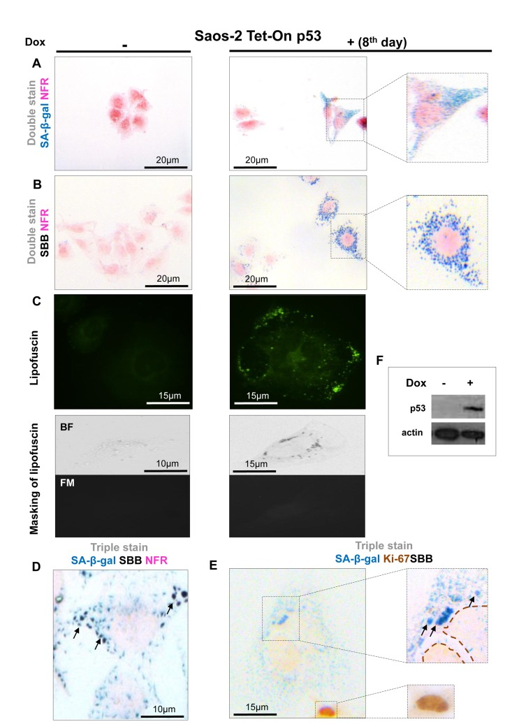 (A) Senescent cells with the characteristic morphology (enlarged and flattened) and positivity for SA-β-gal staining (turquoise color), on the 8th day of induced with doxycycline of the Saos-2 p53 Tet-On system. (B) Sudan Black B (SBB) perinuclear accumulation as dark blue-black granules, in cells with senescent morphology. (C) Top panels: Perinuclear appearance of lipofuscin in apparently senescent cells: pseudocolor visualization of lipofuscin's auto-fluorescence (450-490 nm) is represented in green. Bottom panels: Lipofuscin's auto-fluorescence (FM, fluorescence microscopy) is masked by SBB staining (BF, bright field microscopy). (D) Co-localization of SA-β-gal and SBB staining in senescent cells and, (E) Ki67 positive cells are negative for SBB and SA-β-gal. (F) Addition of 5μg/ml doxycyclin (Dox) leads to p53 expression. Brown dashed lines: Ki67- negative nuclei, black arrows: SBB granules, NFR: nuclear fast red counterstain.