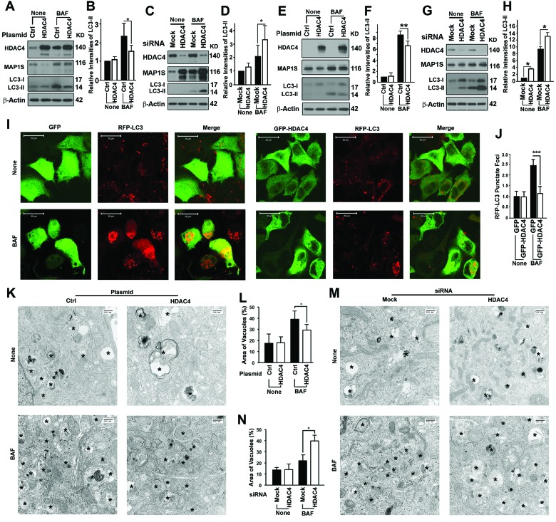 (A-D) HDAC4 affects levels of MAP1S and LC3-II in HeLa cells in the absence (None) or presence of BAF. Representative immunoblot results (A, C) and their respective quantification (B, D) of the impact of HDAC4 overexpression (A, B) and HDAC4 suppression with siRNA (C, D) are shown. (E-H) HDAC4 affects levels of MAP1S and LC3-II in N2a cells in the absence (None) or presence of BAF. Representative immunoblot results (E, G) and their respective quantification (F, H) of the impact of HDAC4 overexpression (E, F) or HDAC4 suppression with siRNA (G, H) are shown. (I, J) HDAC4 overexpression reduces punctate foci of RFP-LC3 in HeLa cells stably expressing RFP-LC3. Fluorescence microscopy images (I) and quantification (J) of punctate foci of RFP-LC3 in the absence or presence of BAF are shown. (K-N) HDAC4 overexpression (K, L) or siRNA suppression (M, N) alters the vacuolar areas in HeLa cells. Transmission electron microscopic images (K, M) and quantification (L, N) are shown. Symbol “*” indicates vacuoles.