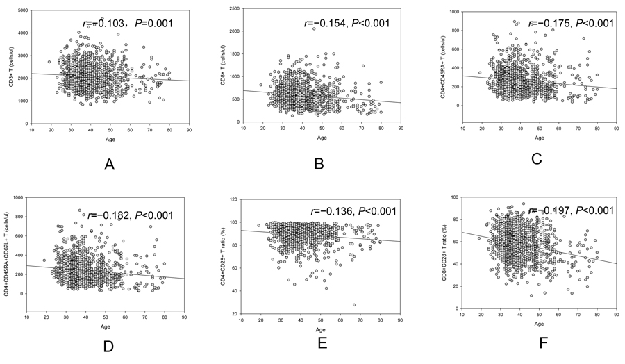 A trend of decrease in CD3+ T cell counts (r=−0.103, p=0.001, Figure 1A), CD3+CD8+ T cell counts (r=−0.154, p<0.001, Figure 1B), CD4+CD45RA+ T cell counts(r=−0.175, p<0.001, Figure 1C), CD4+ CD45RA+CD62L+ T cell counts(r=−0.182, p<0.001, Figure 1D), CD4+CD28+ /CD4+ ratio (r=−0.136, p<0.001, Figure 1E) and CD8+CD28+/CD8+ ratio (r=−0.197, p<0.001, Figure 1F) was observed with increased age. An increase trend with aging in CD4+/CD8+ ratio (r=0.160, p<0.001) was showed in our study.