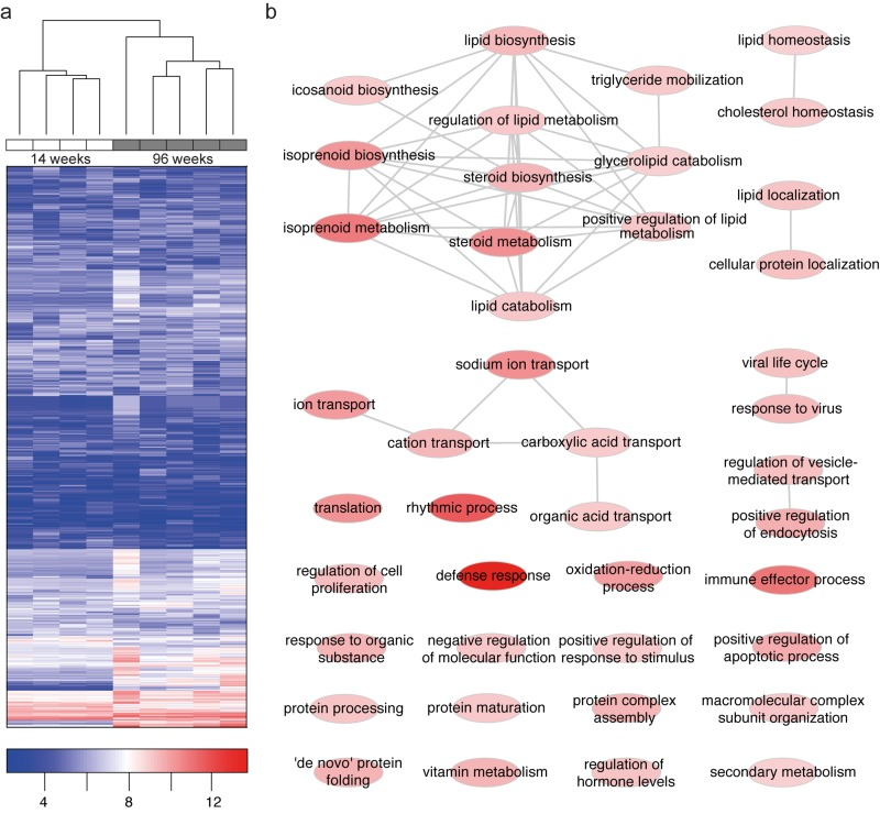 Figure 2. Microarray analysis reveals age-specific clustering and differentially expressed genes to be associated with lipid metabolism. (a) Hierarchical clustering of 1000 genes with the strongest variation reveals age-specific clustering. Genes with low expression are depicted in blue color, genes with high expression in red color. (b) Gene ontology (GO) enrichment of differentially expressed genes (96W – 14W WT kidney). We observed a strong enrichment of lipid and lipoprotein metabolism, of immune system and defense response, of small ion transport and transmembrane transport in aged wild-type kidneys (see also Data Set 2). Nodes of GO terms are color-coded according to enrichment strength.