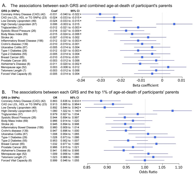 Figure 1. Genetic risk score associations with parents age at death. Forest plots show the relationship between the genetic risk scores (GRS, z-transformed) and 2 different parental longevity traits. Results from regression models (see methods). * indicates the association is significant after adjustment for multiple testing. (A) Linear regression results for combined parent's age at death. N=45,627. Coefficients (‘coef’) show the standard deviation (SD) difference in GRS per SD of parent's age at death. The results for `CAD (no Lipids)` and `LDL cholesterol` only appear identical due to rounding; the effects were very similar. (B) Logistic regression results for the binary trait “participants of at least one parent reaching the top 1% of the age-at-death distribution vs. participants who parents did not”. Discordant participants (i.e. one long-lived and one short-lived) were excluded. n=42,273. n=1,339 participants of at least one long-lived parent (mother aged ≥98 years or father aged ≥95 years). Includes participants with alive parents reaching these limits. Odds Ratios (OR) show the likelihood of participants having at least 1 parent reaching the top 1% of age-at-death distribution per SD difference in GRS.