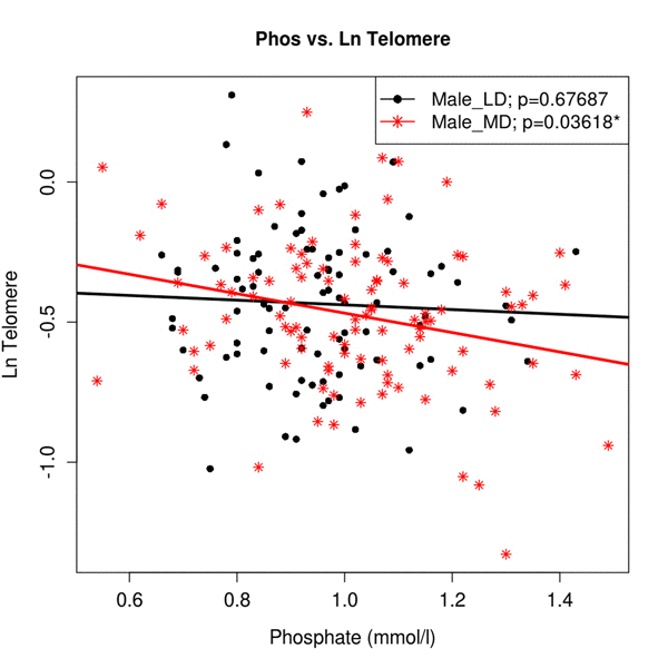 Table 2. Analysis of phosphate levels versus telomere length, DNA methylation content, biochemical parameters and income, with data adjusted for age, gender and deprivation status