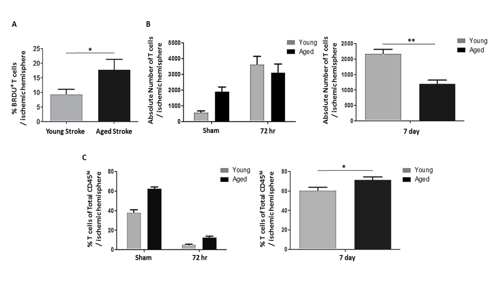 Figure 5. The effects of age and stroke on post-stroke lymphocyte infiltration into the brain. (A) A significantly larger proportion of T cells infiltrating into the ischemic hemisphere 72 hours after 90 minute MCAO were BrdU-positive in aged mice compared to young (p<0.05)(n=4-6/group). (B) There was a significant effect of age (F(1,16)=p<0.001) on the number of T cells infiltrating into the brain 72 hours after 90 minute MCAO as measured by 2-way ANOVA, with significantly less T cells infiltrating into the aged ischemic hemisphere 7 days after 60 minute MCAO as assessed by Student's t test (p<0.01, n=4-10/group). (C) There was an effect of age (F(1,16)=p<0.0001), stroke (F(1,16)=p<0.0001) and an interaction between age and stroke (F(1,16)=p=0.0001) on the number of T cells (CD3+) as a proportion of all leukocytes infiltrating into the brain (CD45hi cells in the brain) 72 hours after 90 minute MCAO as measured by 2-way ANOVA, with T cells making up a significantly greater proportion of infiltrating leukocytes in aged mice 7 days after 60 minute MCAO as assessed by Student's t test (p=0.05, n=4-10/group). Values are expressed as mean ± SEM. *, p≤0.05; **, p<0.01.