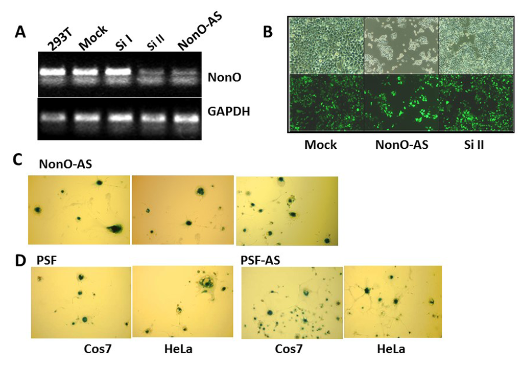 Figure 2. Knockdown of NonO or PSF induces senescence. (A) Knockdown efficiencies for NonO siRNAs (si) and antisense (AS) cloned in pSuper-GFPNeo. Total RNA was isolated from 293T cells harvested 48 hr after calcium phosphate transfection with 10 μg either Si I or Si II silencing RNAs or with NonO AS DNA. Approximately 0.5 μg total RNA was reverse transcribed into cDNA which was analyzed by semi-quantitative PCR. (B) Growth reduction 72 hr post NonO knockdown as assessed by expression of pSuper-encoded GFP fluorescence microscopy at 1X and 10X magnification. (C) AS knockdown of NonO promotes senescence in Cos7 cells. G418-selected NeoR clones of Cos7 or HeLa transfectants assayed at the indicated population doubling (PD) by SA-β-gal staining. (D) Overexpression (OE) or knockdown (AS) of PSF expression induces senescence in Cos7 or HeLa cells analyzed in bulk 96 hr following transfection.