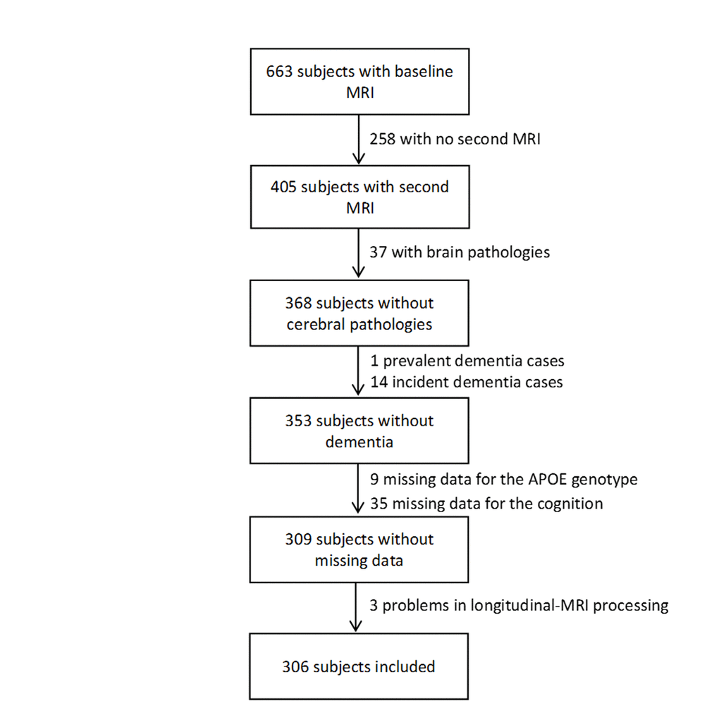 In Bordeaux, 663 MRI examinations were performed at baseline. Among them, 405 subjects underwent a second MRI examination 4 years later. Subjects were excluded from the analyses if they presented severe brain pathologies (n=37, tumor, stroke, severe leucoaeriosis), a prevalent dementia (n=1), an incident dementia between the two scan examinations (n=14), missing data for the ε4 allele of the apolipoprotein E gene (ApoE ε4) (n=9), for the FCSRT and the IST scores (n=35), and a technical problem in longitudinal MRI processing (n=3). Finally, MRI analyses were conducted on 306 subjects (Figure 4).