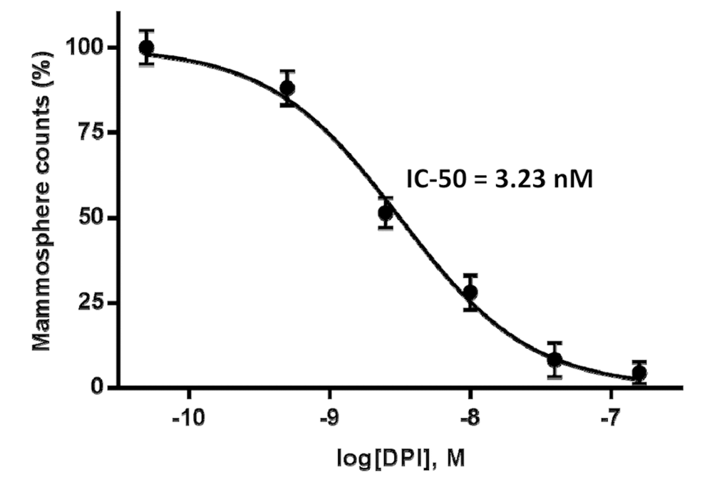 Figure 7 highlights that DPI dose-dependently inhibited CSC propagation, as assessed using the mammosphere (3D tumor sphere) assay. To determine the potential anti-CSC activity of DPI, MCF7 cells were first seeded into low-attachment plates and allowed to form mammospheres over a period of 5 days. The mammosphere assay was performed over the range of 0.2 nM to 10 µM DPI. Remarkably, DPI treatment significantly reduced CSC propagation, in a concentration-dependent manner, with an IC-50 of 3.23 nM.