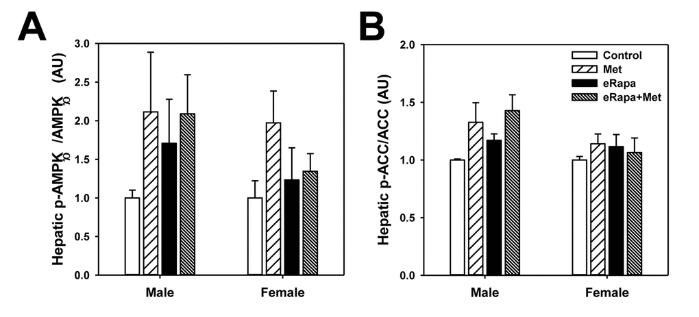 While the mechanism action of metformin is incompletely understood, it has been reasonably well-accepted that metformin activates the AMP-activated protein kinase (AMPK) signaling pathway particularly in the liver. In male mice, phosphorylation of the AMPKα subunit was unchanged by either rapamycin or metformin (2 way ANOVA eRAPA F=0.4, p=0.54, metformin F=1.9, p=0.19, interaction F=0.4, p=0.51) (Figure 6 and Supplementary Figure 2). We found a similar results for AMPKα subunit phosphorylation in females (2 way ANOVA eRAPA F=0.4, p=0.57, metformin F=2.6, p=0.13, interaction F=1.7, p=0.22). However, metformin significantly increased phosphorylation of one of the effectors of AMPK, Acetyl-CoA carboxylase (ACC), in male (2 way ANOVA eRAPA F=1.4, p=0.25, metformin F=6.7, p=0.024, interaction F=0.1, p=0.76), but not female mice. In general, these data point to only moderate activation of AMPK signaling at this dose of metformin delivered through the diet.
