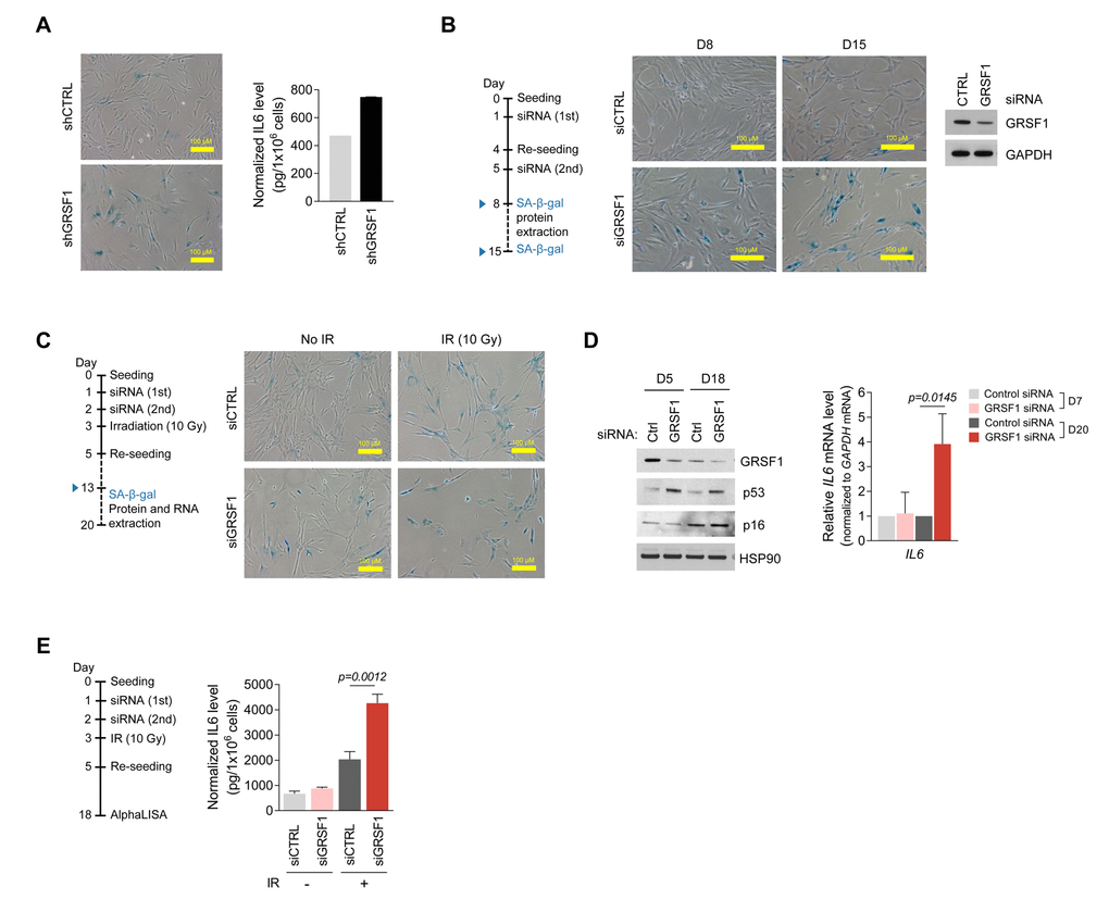 Figure 4. Silencing GRSF1 promotes senescence and IL6 production. (A) Three weeks after silencing GRSF1 by infection with shGRSF1- or shCTRL-expressing lentiviruses, SA-β-gal activity was assessed by light microscopy (left) and secreted IL6 was quantified by ELISA (right). (B) Pre-senescent WI-38 fibroblasts were transfected with siGRSF1 or siCTRL; SA-β-gal activity (micrographs) was assessed at day 8 (D8) and D15 after transfection. At D8, GRSF1 and GAPDH levels in WCL were assessed by Western blot analysis (right). (C,D) WI-38 cells transfected with siGRSF1 or siCTRL were irradiated (IR, 10 Gy) and subsequently cultured for 10 days; whereupon SA-β-gal activity was assessed (C); proteins in WCL prepared at D5 and D18 were assessed by Western blot analysis (D, left). RNA was extracted at D7 and D20, and IL6 mRNA levels were quantified by RT-qPCR analysis (D, right). (E) After transfection with siGRSF1 or siCTRL and irradiation, WI-38 cells were cultured in normal medium for 14 days and in serum-free condition for 24 h (left). CM was then collected, and the secreted IL6 was assayed by AlphaLISA (right). Data in (D,E) represent the means ±S.D. from three independent experiments.