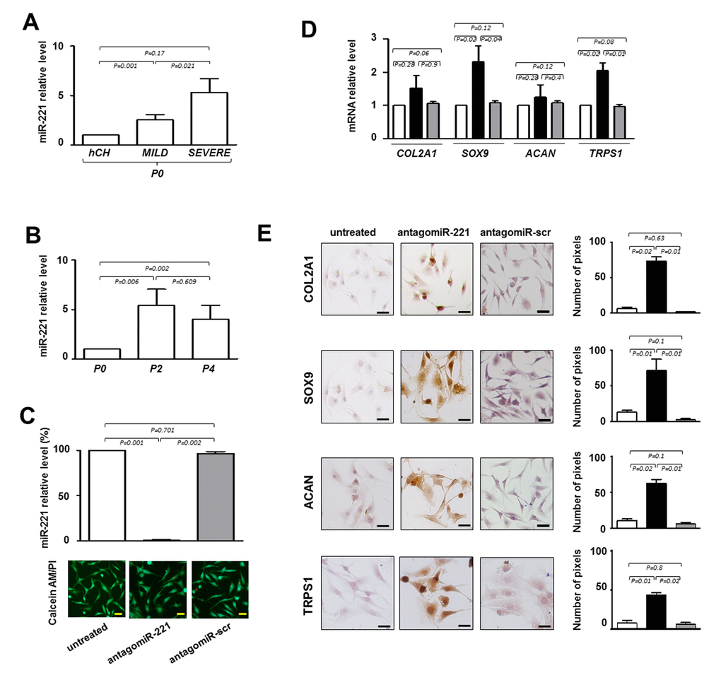 Figure 2. Evaluation of the effect of antagomiR-221 treatment on intervertebral disc cells (IVD) cells. (A) Before transfection the expression levels of miR-221 were measured in P0 cells from MILD and SEVERE IDD by qRT-PCR. Data are presented as fold changes relative to control represented by human freshly isolated chondrocytes (hCH). Results represent mean ± SD (hCH group, n = 6; MILD group, n = 7; SEVERE group, n = 9). Exact P-values are reported. (B) miR-221 levels were measured during de-differentiation process from passage 0 (P0) to passage (P4). Data are presented as fold changes relative to P0 cells. (P0 group, n = 6; P2 group, n = 6; P4 group, n = 6). Exact P-values are reported. Monolayered P2 cells were then transfected with antagomiR-221 (black column), a scrambled oligonucleotide (antagomiR-scr) (gray column) or remained untreated (white column) (C, D, E). (C) The efficiency of miR-221 knockdown was determined by qRT-PCR (C) and data are presented as fold change respect to control untreated cells ±SD (n = 10). Exact P-values are reported. Cell viability of transfected cells was determined by double staining with Calcein-AM/propidium iodide. The green fluorescence indicates the presence of calcein-labeled live cells, while propidium iodide-labeled dead cells are revealed by red fluorescence. Merged photomicrographs are reported. Scale bars: 20 μm. Expression of COL2A1, SOX9, ACAN and TRPS1 chondrogenic markers was assessed by qRT-PCR D) and immunocytochemistry E). (D) The expression of typical chondrogenic markers evaluated at mRNA level. mRNA data are presented as fold change relative to untreated cells. Results represent means ± SD (n = 10). Exact P-values are reported. (E) The expression of typical chondrogenic markers evaluated at protein level. Representative optical photomicrographs of COL2A1, SOX9, ACAN and TRPS1 immunostaining are reported. Protein levels were quantified by densitometric analysis of immunocytochemical pictures using ImageJ software and expressed as means of pixels per one hundred cells ±SD (n = 10). Exact P-values are reported. Scale bars: 20 μm.