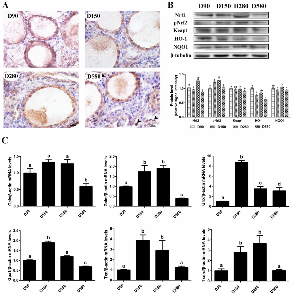 Figure 1. Age-related changes in the activity of the Nrf2/HO-1 pathway. (A) Immunohistochemistry of Nrf2 in the ovaries of hens aged 90, 150, 280 and 580 days, scale bar: 10 μm, black arrowheads: Nrf2 located in the nucleus. (B) Age-related changes in relative expression levels of Nrf2, pNrf2, Keap1, HO-1 and NQO1. (C) Age-related changes in transcription levels of Nrf2/HO-1 downstream genes: Gclc, Gclm, Glrx, Gpx1, Txn, Txnrd. Values are expressed as the means±s.e.. The relative abundance of each transcript was normalized to a β-actin and expressed as fold change over D90 ovaries. Different lowercase letters indicate significant differences (P < 0.05).