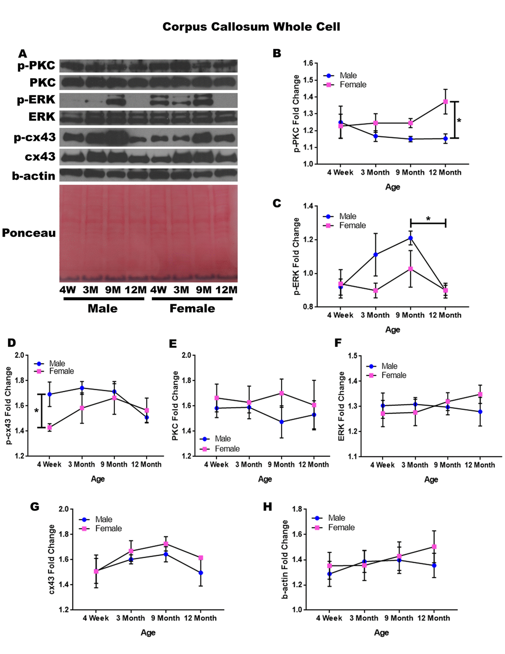 Figure 7. Signaling downstream of estrogen in the corpus callosum across age and gender. Representative western blots for each protein of interest and a representative Ponceau stain as a load control (A). Graphical depiction of the fold change for p-PKC (B), p-ERK (C), p-cx43 comparing gender (D), PKC (E), ERK (F), cx43 (G), beta-actin (H). Error bars = SEM. 4W = 4 weeks of age; 3M = 3 months of age; 9M = 9 months of age; 12M = 12 months of age. Pink = female; blue = male. ANOVA with Tukey posthoc, * = P<0.05.