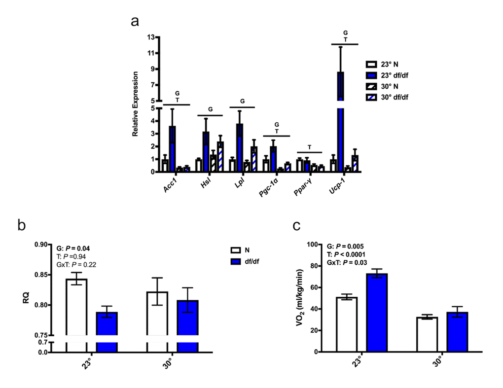 Figure 4. Increased eT diminished non-shivering thermogenesis and energy metabolism in dwarf mice. (a) Gene expression in brown adipose tissue, (b) respiratory quotient, and (c) rate of oxygen consumption (n = 5-8). N = normal, df/df = dwarf, RQ = respiratory quotient, VO2 = rate of oxygen consumption. The results of the Two-way ANOVA are reported as G (effect of genotype), T (effect of temperature), and GxT (interaction of genotype and temperature). Significant effects (P < 0.05) are in bold text.