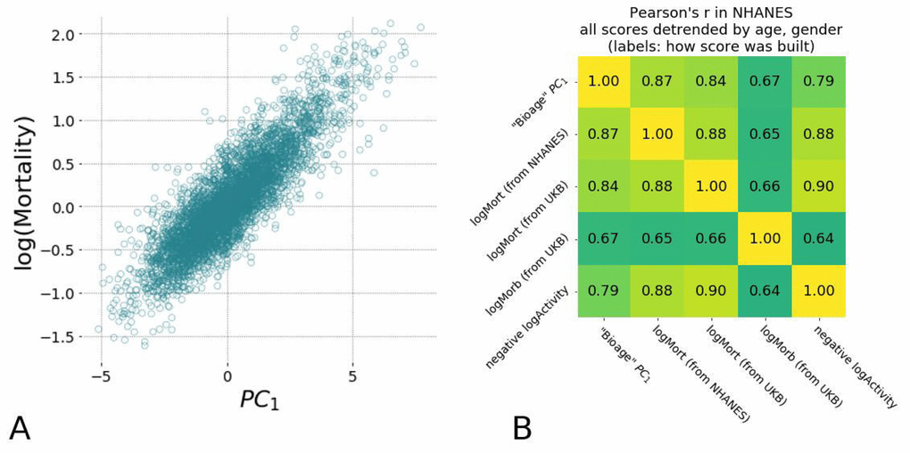 Having established that the expected pattern of exponential mortality exists in the NHANES dataset, we used a Cox proportional hazards model [22], with gender and all of the physiological variables obtained from the locomotor activity as covariates. The mortality risks model was trained on data for NHANES participants aged 40 and older and was then used to estimate the logarithm-scaled risk of mortality for participants from both NHANES and UKB datasets. For simplicity, we will denote these predicted risks as “logMort” to distinguish them from the “biological age” and other models utilized in this study. The risk of death was found to increase exponentially as a function of biological age (Fig. 3A; the determination coefficient of the corresponding log-linear model R2=0.81). This further supports our conjecture that the PC1 score is a quantitative measure of the biological aging progress. These data suggest that the logarithm of the risk of death may serve as a viable but essentially equivalent approach to evaluate biological age.