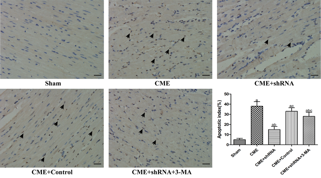 Figure 4. Inhibition of Egr-1 decreased the myocardial AI following CME. TUNEL staining of the microinfarcted myocardium stained the apoptotic nuclei yellow-brown, while the normal nuclei were stained light blue. The arrows indicate apoptotic nuclei (x400, scale bar = 25 μm). The results are presented as the means ± SD from at least three independent experiments. aP < 0.05 compared with the Sham group; bP < 0.05 compared with the CME group; cP < 0.05 compared with the CME+shRNA group.