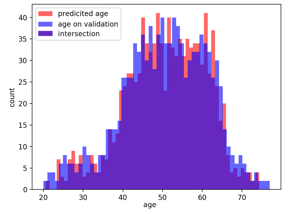 The distributions of predicted age labels in the validation dataset resembles the age distribution in the dataset (see Fig. 6).