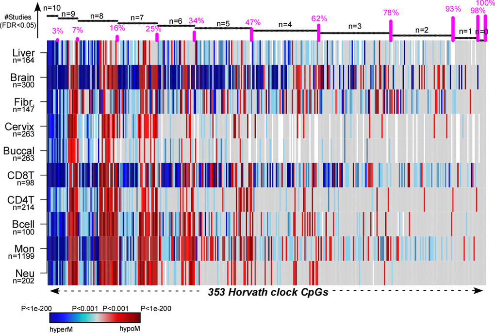 Figure 6. Pan-tissue analysis of Horvath’s clock CpGs. Heatmap displays the signed P-values of the 353 Horvath Clock CpGs across 10 independent cell or tissue-types, where the P-values derive from a linear model of DNAm against age plus additional confounders as covariates. Blue denotes highly significantly age-associated hypermethylation (hyperM), red denotes highly significant hypomethylation (hypoM). The 353 clock CpGs have been ranked according to the number of cell/tissue types where they are age-DMPs (using FDR<0.05), indicated by horizontal black bars at top. The cumulative proportion of the 353 CpGs that are age-DMPs in 10, 9, 8, 7, 6, 5, 4, 3, 2 or 1 studies are shown as vertical bars.