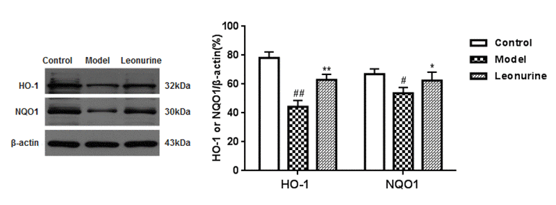 Figure 9. Effect of leonurine on the expressions of Nrf2 protein in the nuclear fraction (A) and cytosolic fraction (B) using western blot analysis. Data are presented as mean ±SD from each group(n=6, mean±SD). #P < 0.05 and ##P < 0.01 vs control group; *P < 0.05 and **P < 0.01 vs model group.