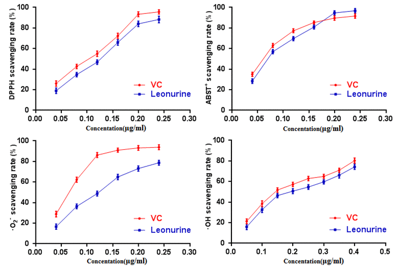 Oxidative stress (OS), which is a negative effect produced by reactive oxygen species (ROS), has been regarded as one of the most significant factors in the ontogeny of many multifactorial diseases, including aging, cancer, Parkinson's disease and diabetes. DPPH, ABTS+, O2· and ·OH are four kinds of free radicals that are usually used to assess the antioxidant capacity of natural crude drugs and health foods [19,20]. Hence, DPPH, ABTS+, O2·and ·OH assays were evaluated to assess the antioxidant capacity of leonurine in this study. The results showed that leonurine possessed a good ability to scavenge DPPH radicals in a dose-dependent manner, and the 50% effective concentration (EC50) (447.78±4.66 μmol·L-1) was lower than that of VC (774.54 ± 6.08 μmol·L-1) (Fig. 2A). The results from the ABTS+ radical scavenging assay (Fig. 2B) also showed that leonurine exerted a strong activity to scavenge ABTS+, and it was found that the EC50 of leonurine against ABTS+ was 408.36±3.60 μmol·L-1, whereas that of VC was 659.09±5.51 μmol·L-1. The scavenging effects of leonurine on O2·and OH were also determined, and the results showed that the EC50 of leonurine and VC for O2·(·OH) were 450.16±7.33 (681.82±6.36) μmol·L-1 and 707.40±4.95 (1238.63±7.16) μmol·L-1, respectively, indicating that the scavenging rate of leonurine towards O2·and OH was comparable to VC (Fig. 2C and 2D).