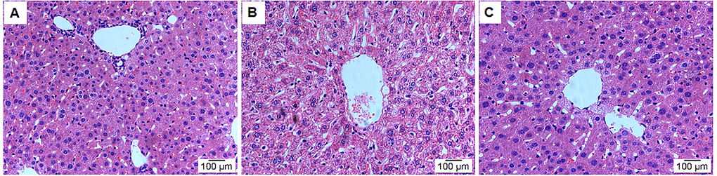 HE staining was used to analyse the effects of leonurine on the liver tissue histopathological features from aging mice. As shown in Fig. 5, the model group showed significant liver damage, including hepatocellular hydropic degeneration, necrosis, and inflammatory cell infiltration. However, there was an obvious increase in hepatocellular hydropic degeneration and necrosis upon treatment with leonurine compared to the mice in the model group. These findings suggested that hepatic pathological changes could be ameliorated by leonurine intervention.