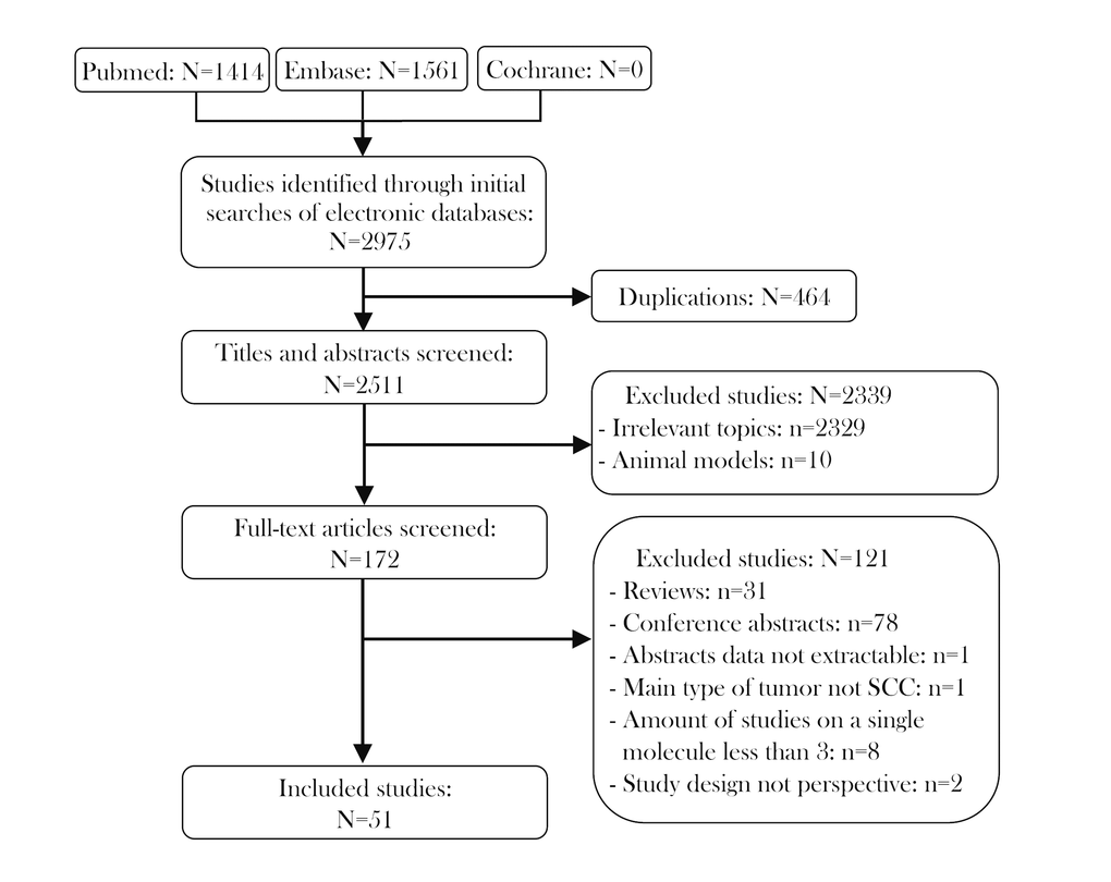 | PD-L1: programmed death ligand 1; PD-1: programmed death 1; IDO: indoleamine 2, 3-dioxygenase; M/F: male/female; NA: not available; OSCC: oral squamous cell carcinoma; HNSCC: head and neck squamous cell carcinoma; NPC: nasopharyngeal carcinoma; OPSCC: oropharyngeal squamous cell carcinoma; HPSCC: hypopharyngeal squamous cell carcinoma; SSCC: sinonasal squamous cell carcinoma; LSCC: laryngeal squamous cell carcinoma; cut-off value: the value that can be diagnosed as positive/high expression of an immune checkpoint molecule; AQUA: automated quantitative analysis; IHC: immunohistochemistry; IF: immunofluorescence; qRT-PCR: quantitative reverse transcription polymerase chain reaction; FACS: fluorescence-activated cell sorting; FISH: fluorescence in situ hybridization; OS: overall survival; DFS: disease-free survival; DMFS: distant metastases-free survival; DSS: disease-specific survival; PFS: progression-free survival; P: prospective; NOS: Newcastle–Ottawa Quality Assessment Scale. | |||||||||||||||||||||||||||||||||||||||||||||||||||||||||||||||||||||||||||||||||||||||||||||||||||