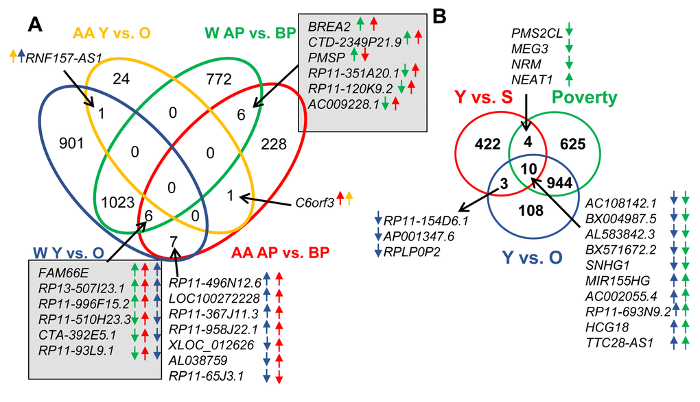 Figure 2. Comparison of lncRNA level changes with age, poverty and senescence. (A) Significantly changed lncRNA abundance was compared between African American (AA) males living below poverty (BP) and above poverty (AB) to white males (W) living below and above poverty. (B) Changes in lncRNAs levels in whites with poverty and age were also compared to significantly changed senescence-associated lncRNAs (SAL-RNAs) identified previously [31]. The comparisons in (A) were done using the Seqname and (B) using Gene symbol, hence the slight differences in numbers. Arrows indicate the direction of change (higher or lower) in the comparisons. The color of the arrow indicates the comparison examined.