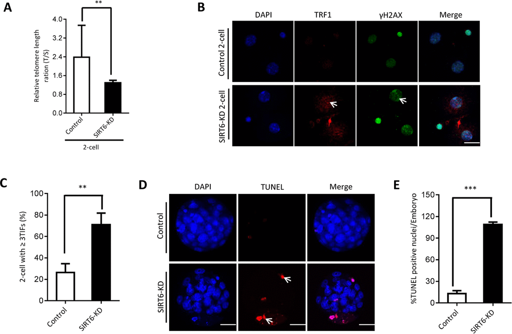 The phenotypes in old oocytes/embryos mentioned above prompted us to ask whether they are associated with the loss of SIRT6 in oocytes. To address this question, normal MII oocytes were microinjected with specifically designed siRNAs to knock down the SIRT6 level (SIRT6-KD, Figure 3A). Immunoblotting confirmed that siRNA injection led to a dramatic reduction in SIRT6 protein expression in oocytes (Figure 3B). Next, we carried out in vitro fertilization (IVF) of control and SIRT6-KD oocytes, and then zygotes were cultured to check the subsequent embryonic development. As shown in Figure 3C–3D, early embryos derived from SIRT6-KD oocytes displayed a significant decrease in blastocyst formation (red arrows) and increase in cytoplasmic fragmentation in comparison to controls. These observations indicate the compromised developmental potential of early embryos when SIRT6 was abated in oocytes. SIRT6 loss is associated with the dysfunction of telomeres via affecting telomeric chromatin structure. In line with notion, telomeres shortened markedly in 2-cell embryos derived from SIRT6-KD oocytes compared to control embryos (Figure 4A). Moreover, we found that >3 TIFs were frequently detected in 2-cell embryos originated from SIRT6-KD oocytes (Figure 4B–4C). Telomeres are composed of repetitive G-rich sequence and specific binding proteins that together stabilize the ends of chromosomes. These structures are closely related to cellular apoptosis [25, 26]. To evaluate the apoptotic status, Terminal dUTP Nick End Labeling (TUNEL) assay was conducted on control and SIRT6-KD blastocysts. As shown in Figure 4D–4E, TUNEL positive nuclei were hardly detected in normal blastocyst. In contrast, the proportion of apoptotic blastomeres was significantly increased in embryos derived from SIRT6-KD oocytes. Altogether, these results indicate that oocyte SIRT6 is important for maintaining the telomere function and genome integrity in early embryos, thereupon determining the developmental competence.