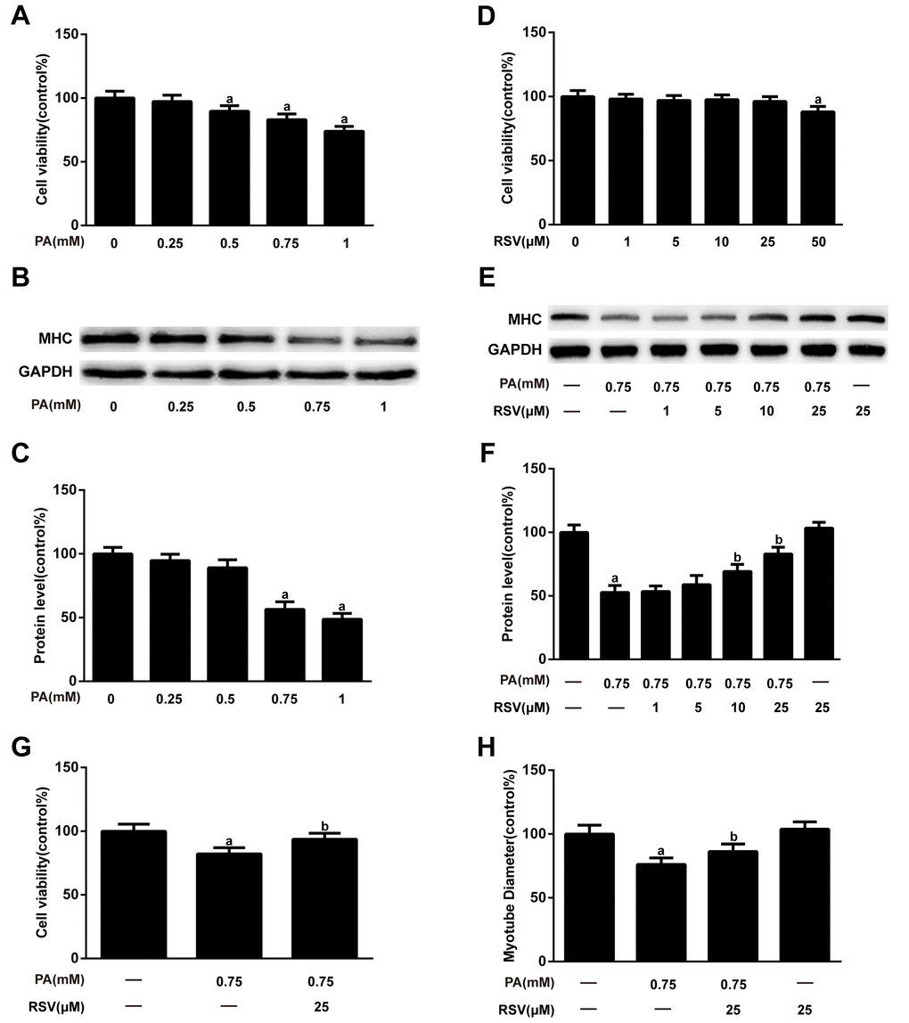 Figure 5. RSV inhibits PA-induced muscle atrophy in L6 myotubes. (A) Myotubes were treated with different doses (0.25, 0.5, 0.75, or 1 mM) of PA for 24 h, and cell viability was measured using a CCK-8 assay. (B) Representative image of the western blotting results for MHC; GAPDH was used as a loading control. (C) The bar chart shows the quantification of MHC. (D) Myotubes were treated with RSV at a series of concentrations (1, 5, 10, 25 or 50 μM) for 24 h, and cell viability was detected by CCK-8 assay. (E) Myotubes were treated with 0.75 mM PA in the presence or absence of different concentrations (1, 5, 10 and 25 μM) of RSV for 24 h. The protein expression of MHC was measured by western blotting. (F) The bar graph shows the quantification of MHC. (G) Myotubes were exposed to 0.75 mM PA in the presence or absence of 25 μM RSV for 24 h, and cell viability was detected by a CCK-8 assay. (H) Quantification of the myotube diameter, as described in the Materials and Methods section. Data are expressed as the mean ± SD. aP < 0.05 vs. the control group; bP < 0.05 vs. the PA-treated group.