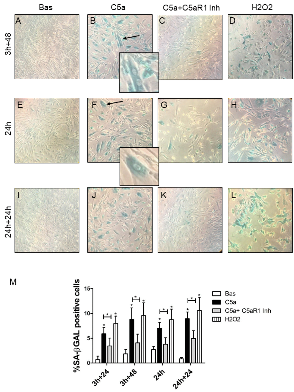 Figure 4. SA-β Gal staining in RTEC treated with C5a with or without C5aR1 blocking. SA-β-Gal activity in early passage RTEC exposed to 100 nM C5a for 3h (B, F) or 24h (J). For C5aR1 inhibition, mouse monoclonal anti-C5aR1 was pre-incubated for 1h before the C5a exposure and then maintained in fresh medium for 24h or 48h (C, G, K). More SA-β-gal+ cells were observed after C5a exposure, senescent RTEC appeared enlarged and morphologically distinct from the normal cells at the same passage with formation of larger and polynucleated cells (B and F, arrows). Untreated cells are also named as Basal (A, E, I). H2O2 exposed cells were used as positive control of senescence (D, H, L). Representative images were acquired by phase contrast microscopy. (M) Quantification of SA-β-Gal+ cells cultures. The ratio of cells positive for SA-β-gal activity was calculated by examining five not overlapping fields per condition (6-well plate). The results are presented as the mean ± SD of three independent experiments (*p< 0.05), Magnification 40X.