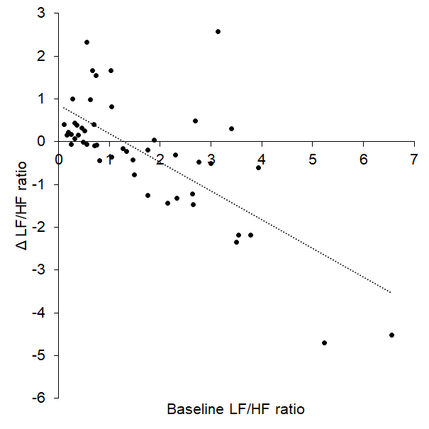 Frequency-domain HRV parameters included: the low frequency (LF) component, detected at 0.04-0.15 Hz; the high frequency (HF) component, detected at 0.15-0.40 Hz; total power (0.04-0.40 Hz) and normalised values for LF and HF power (nuLF and nuHF). The HF component has been associated with parasympathetic modulation of heart rate [48], whereas LF power reflects both parasympathetic and sympathetic modulation of heart rate [49]. The ratio of LF to HF power (LF/HF) was also calculated along with normalised LF/HF (nuLF/HF) where baseline values were set to 1. A decrease in LF/HF ratio suggests a shift in cardiac autonomic input towards either reduced sympathetic activity and/or increased vagal parasympathetic activity.