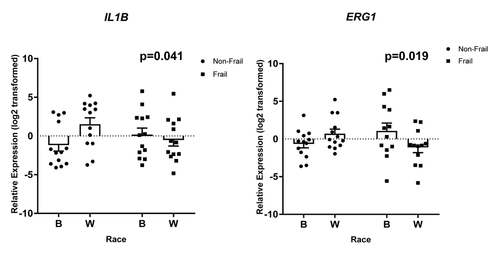 Figure 7. Frailty-associated changes in gene expression with race. Total RNA was isolated from PBMCs from non-frail and frail blacks and whites in the validation cohort (n=52). Gene expression was analyzed using RT-qPCR with gene specific primers. The scatter plots show the relative expression (log2 transformed) in non-frail and frail blacks (B) and whites (W). The open bars represent the mean and error bars show standard error of the mean. There is a significant two-way interaction between frailty status and race for IL1B (p=0.041) and EGR1 (p=0.019). Significance was determined using linear regression models on the log2 transformed values.