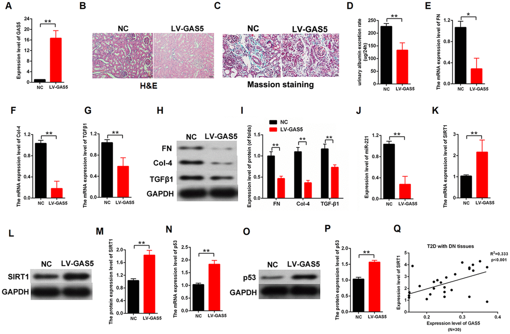 Figure 8. Upregulation of lncRNA GAS5 alleviated DN in vivo. (A) H&E staining of DN results. The LV-GAS5 group was injected with LV-GAS5, and the LV-NC group was injected with LV-NC (LV-GAS5 group=8, LV-NC group=8); (B) The expression level of lncRNA GAS5 was measured by qPCR in both groups; (C) Urinary albumin excretion rate was decreased in the LV-GAS5 group compared with that in the LV-NC group; (D–F) The expression level of FN (D), Col-4 (E), and TGFβ1 (F) were measured by qPCR in the DN rat model transfected with LV-GAS5 or LV-NC; (G–H) The expression level of FN, Col-4, and TGFβ1 were measured by western blot in the DN rat model transfected with LV-GAS5 or LV-NC; (I) qPCR results revealed that the expression level of miR-221 decreased in the DN rat model transfected with LV-GAS5; (J–L) The expression level of SIRT1 was upregulated in the DN rat model transfected with LV-GAS5; (M–O) The expression level of p53 was upregulated in DN transfected with LV-GAS5; (P) qPCR results revealed that there is positively correlation between lncRNA GAS5 and SIRT1 (Figure 8P). (Q) The relationship between the expression level of GAS5 and SIRT1 was detected by qPCR in T2D with DN tissues (N=30). *P < 0.05, **P < 0.01.