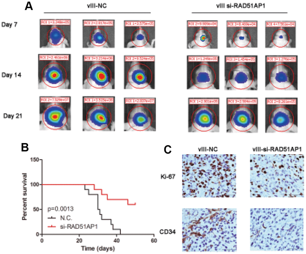 Figure 7. Target knocking down RAD51AP1 inhibited the progression of the EGFRvIII-positive intracranial GBM model. (A) The tumor volumes at the indicated times were evaluated by bioluminescence imaging. (B) Survival rates of mice bearing U87-EGFRvIII and EGFRvIII-siRAD51AP1 tumors. (C) Immunohistochemistry analysis was performed to detect Ki-67 and CD34 expression.