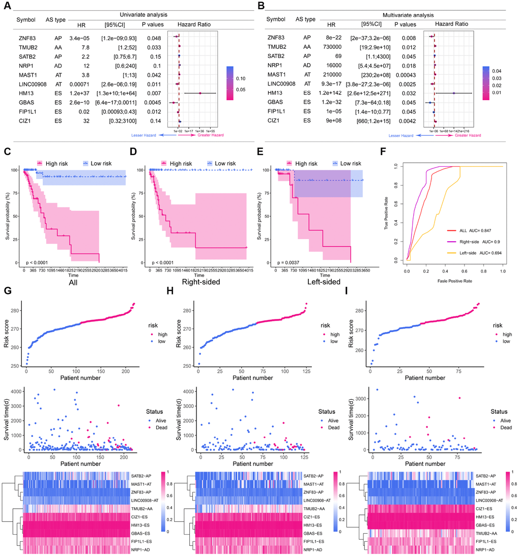 Figure 5. The prognostic value of the DEAS signature. (A) Univariate analysis of the 10 predictive factors for overall survival. P-values are indicated by the color scale on the side. Horizontal bars represent 95% confidence intervals. (B) Multivariate analysis of the 10 predictive factors for overall survival. P-values are indicated by the color scale on the side. Horizontal bars represent 95% confidence intervals. (C) Kaplan-Meier curves of the final prognostic model. Patients were divided into the high-risk and low-risk groups according to the median risk score. (D) Kaplan-Meier curves of the final prognostic model in right-sided colon cancer patients. (E) Kaplan-Meier curves of the final prognostic model in left-sided colon cancer patients. (F) The ROC curves of the final prognostic model in all, right-sided and left-sided colon cancer patients. (G–I) Construction and analysis of risk scores. The top panels indicate the risk scores of the patients. The middle panels depict the survival statuses and survival times of the patients distributed by risk score. The bottom panels display the heatmap of the PSI values for the 10 predictive factors distributed by risk score. (G) all patients; (H) right-sided colon cancer patients; (I) left-sided colon cancer patients.