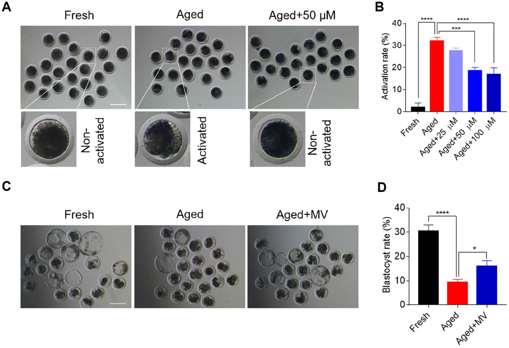 Figure 1. Mogroside V alleviates the deterioration in oocyte quality during in vitro ageing. After in vitro maturation for 44 h, oocytes that extruded the first polar body were continuously cultured in vitro with or without MV (25, 50 and 100 μM) for 24 h. (A) Views of oocytes after activation. (B) Activation rates of oocytes in the fresh, aged, and aged+MV groups. (C) Representative images of blastocysts from fresh, aged and aged+MV oocytes. (D) Blastocyst formation rates of fresh, aged and aged+MV oocytes. MV, mogroside V; Scale bar = 200 μm. The data are presented as the mean ± SEM of at least three independent experiments. * P < 0.05, *** P < 0.001, **** P < 0.0001.