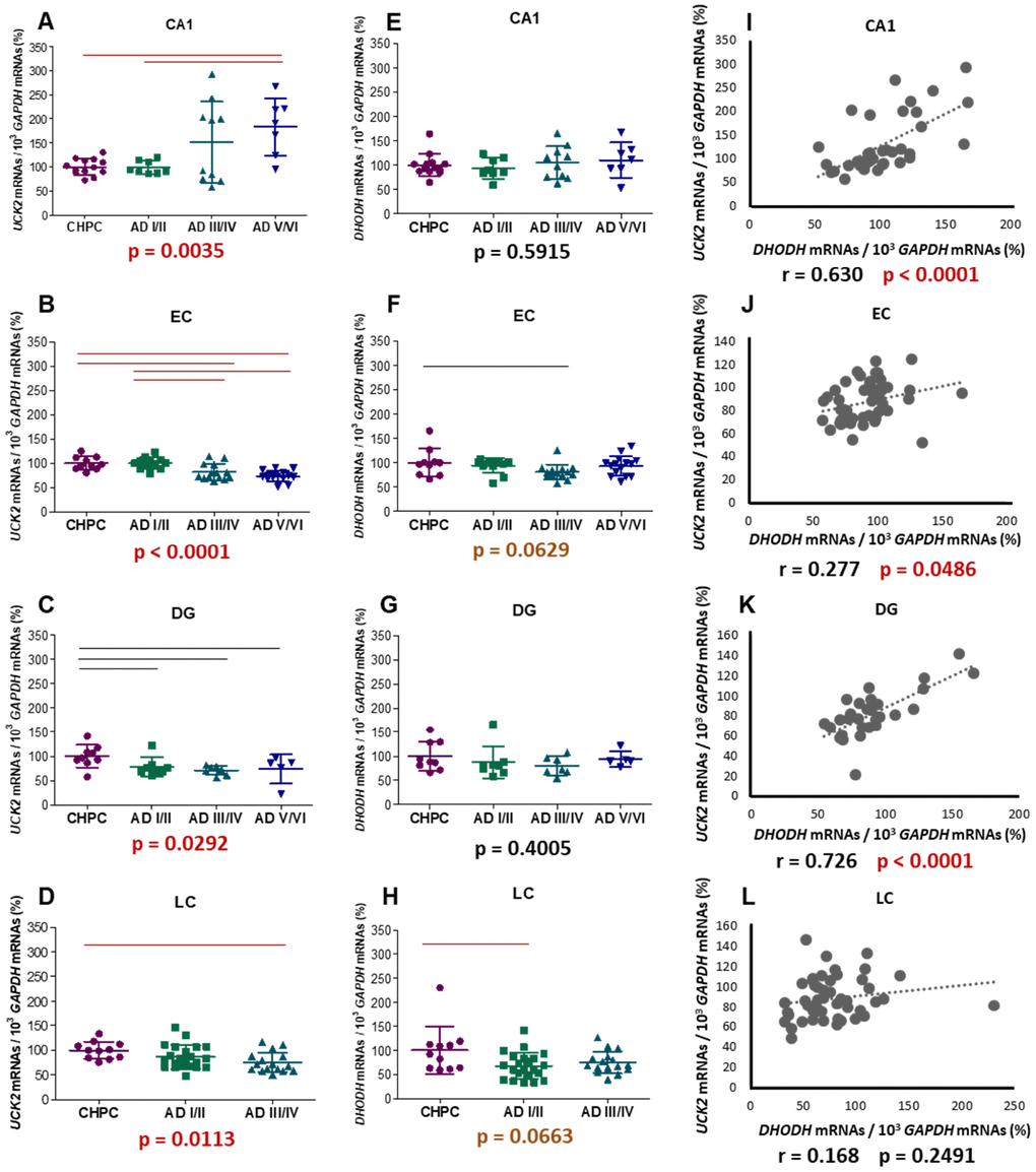 Figure 9. mRNA levels of selected genes encoding proteins from both pyrimidine nucleotide synthesis pathways. Graphs represent mean ± standard deviation values of UCK2 (A–D), DHODH (E–H), and DHODH - UCK2 correlations (I–L); respectively. GAPDH mRNA levels have been used to normalize. CA1: hippocampal cornus ammon 1; EC: entorhinal cortex; DG: dentate gyrus; LC: locus ceruleus. Each point represents an individual sample. The p values for Kruskal-Wallis or ANOVA tests are indicated under the graphs. Red and black horizontal lines indicate significant p values, fulfilling (p < 0.0083, p < 0.0167 in LC) or no (p ≤ 0.05) the post-hoc Bonferroni/Dunn criteria.
