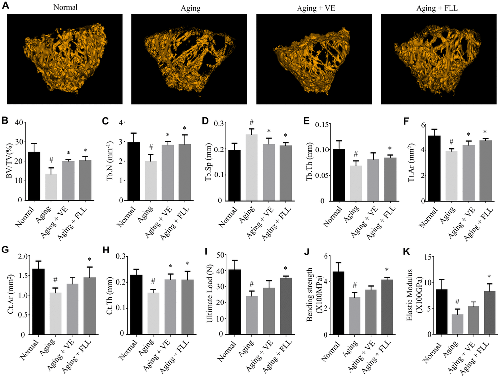 Figure 2. Fructus Ligustri Lucidi (FLL) preserves the bone microarchitecture and bone strength in the femurs of aging mice. Representative 3D reconstructions of trabecular images in the femoral metaphysis by micro(μ)-CT (A). μCT-derived quantification data of femoral metaphysis including BV/TV (%, B), Tb.N (1/mm) (C), Tb.Sp (mm) (D), Tb.Th (mm) (E), Tt.Ar (mm2) (F), Ct.Ar (mm2) (G), Ct.Th (mm, H). Three-point bending examination results including ultimate load (I), bending strength (X100MPa, J), and elastic modulus (X100GPa, K) in the femurs. Data are presented as mean ± SD. # compared with the normal group. * compared with the aging model group. p < 0.05 was considered statistical difference, n = 8.