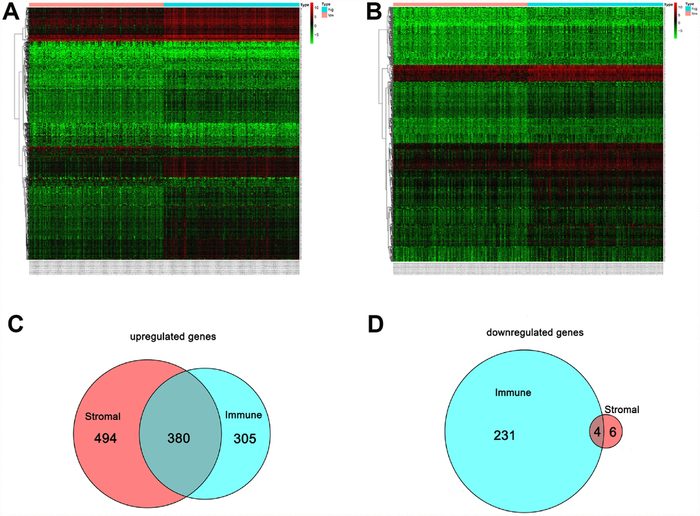 Figure 4. Comparison of the gene expression profile with immune and stromal scores. In the heat maps, genes with higher expression are shown in red, and lower expression are shown in green; genes expressed at the same level are in black. (A) Based on immune score comparisons, 685 genes were upregulated and 235 genes were downregulated in the high score group as compared to the low score group. (B) Based on stromal score comparisons, 874 genes were upregulated and 10 genes were downregulated in the high score group as compared to the low score group. (C) A total of 380 genes were commonly upregulated in the immune and stromal score groups. (D) A total of 4 genes were commonly downregulated in the immune and stromal score groups.