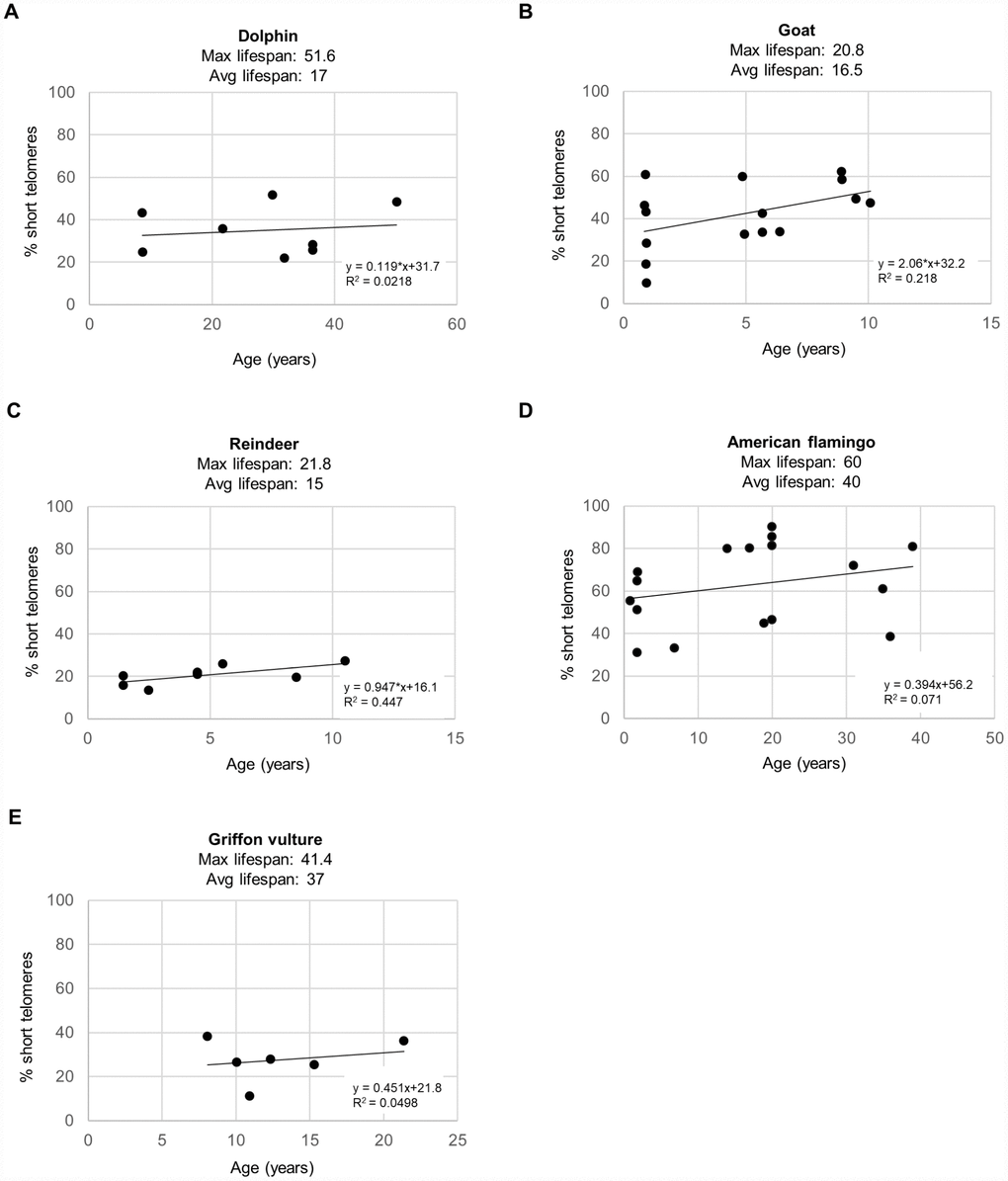Figure 3. Percent short telomeres of various species. The percentage of short telomeres was measured by HT Q-FISH in a high-throughput manner in individuals of different ages for (A) bottlenose dolphins (Tursiops truncatus), (B) goats (Capra hircus), (C) reindeer (Rangifer tarandus), (D) American flamingos (Phoenicopterus ruber), and (E) griffon vultures (Gyps fulvus). Each point represents the values for a different individual. The correlation coefficient (R2), slope (rate of increase of % short telomeres per year), and y-intercept are presented on the graphs. The percentage of short telomeres was calculated by a threshold which corresponds to the 25th percentile of the telomere fluorescence intensity values of a young sample for a given species.