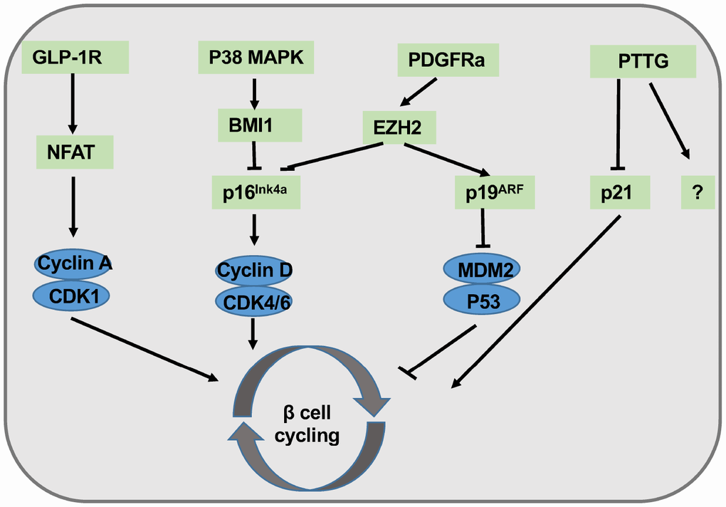 Figure 1. Summary of molecular pathways involved in β cell regeneration. Exendin-4 agonizes GLP-1R signaling, followed by the activation of NFAT and the entry of cell cycling. P38 MAPK signals activate BMI1 and inhibit p16Ink4a. PDGFRa transduces proliferative signals to EZH2, thereby attenuating p16Ink4a activity while enhancing p19Arf activation. PTTG partially promotes β cell proliferation via p21 inhibition.