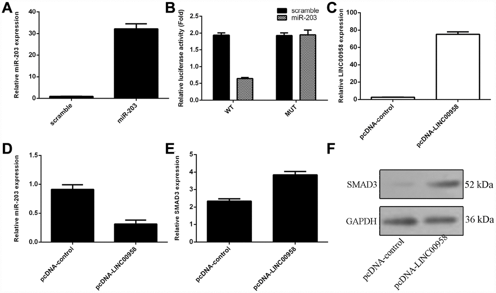 Figure 3. The interaction of lncRNA LINC00958 with miR-203. (A) The expression of miR-203 was measured in the NP cells by using qRT-PCR analysis. (B) Ectopic expression of miR-203 suppressed the luciferase activity of the wild-type LINC00958 3'-UTR but not the mutant LINC00958 3'-UTR. (C) The expression of LINC00958 was measured in the NP cells by using qRT-PCR analysis. (D) Elevated expression of LINC00958 decreased the expression of miR-203 in the NP cells. (E) Overexpression of LINC00958 promoted the mRNA expression of SMAD3 in the NP cells. (F) The protein expression of SMAD3 was detected by western blot, and GAPDH was used as the loading control. U6 was used as the internal control for miR-203. Data were showed as mean±SD.
