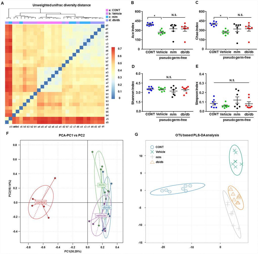Figure 5. Alterations in the gut microbiota profiles of pseudo-germ-free mice after transplantation from db/db and m/m mice. (A) Unweighted UniFrac diversity distance; (B) Ace index (F3,24 = 3.571, P < 0.05); (C) Chao index (F3,24 = 3.415, P < 0.05); (D) Shannon index (F3,24 = 0.6078, P > 0.05); (E) Simpson index (F3,24 = 1.305, P > 0.05); (F) PCA analysis of the data of gut bacteria (PC1 versus PC2); (G) PLS-DA analysis of the data of gut bacteria. Data are shown as mean ± SEM values (n=7). *P < 0.05, **P < 0.01, ***P < 0.001. CONT, control; PCA, principal component analysis; PLS-DA, partial least squares-discriminant analysis; NS, not significant; SEM, standard error of the mean.