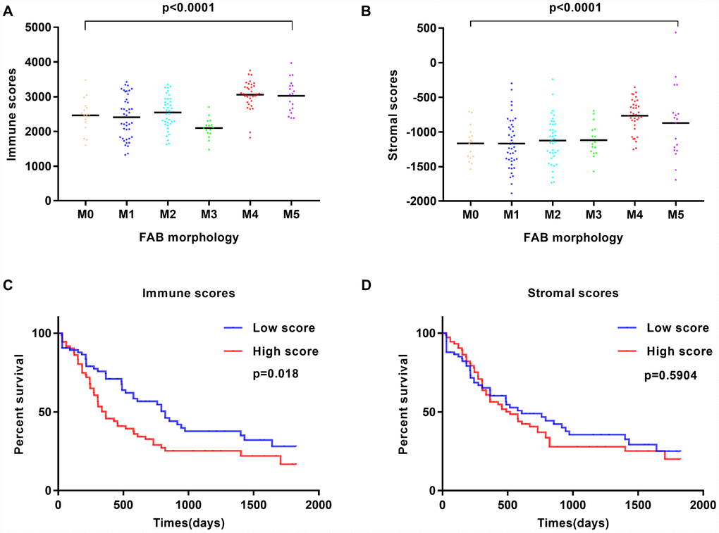 Figure 1. Immune scores and stromal scores are associated with AML FAB subtypes and overall survival. (A) Distribution of immune scores within AML FAB subtypes. Significant associations were detected between AML FAB subtypes and immune scores (n = 173, p < 0.0001). (B) Distribution of stromal scores within AML FAB subtypes. Significant associations were found between AML FAB subtypes and stromal scores (n = 173, p < 0.0001). (C) Kaplan-Meier survival analysis of high vs. low immune score groups (log-rank test, p = 0.018). (D) Kaplan-Meier survival analysis of high vs. low stromal score groups (log-rank test, p = 0.5904).