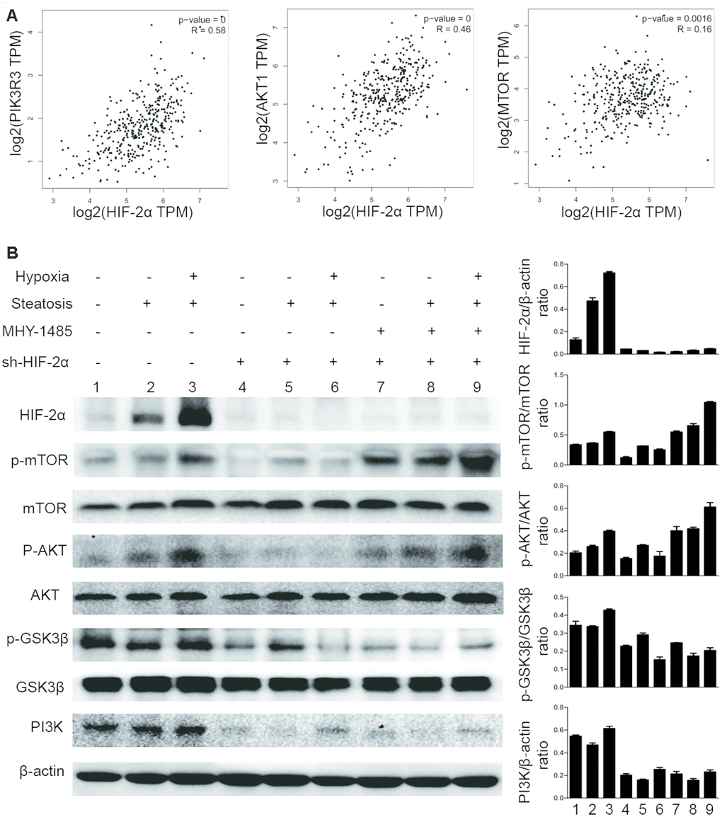 Figure 3. Hypoxia-mediated upregulation of HIF-2α expression activates mTOR signalling pathways. (A) Pearson correlation analysis of the correlation between HIF-2α expression and relative genes in the patients with liver hepatocellular carcinoma (LIHC) from the TCGA database (http://gepia.cancer-pku.cn). (B) Western blot analysis of HIF-2α expression and expression of PI3K-AKT-mTOR pathway factors in HCC and steatotic HCC under hypoxic conditions. β-Actin was used as the loading control. Densitometric analyses of the band intensity ratios for HIF-2α/β-actin, PI3K/β-actin, p-GSK3β/GSK3β, p-AKT/AKT and p-mTOR/mTOR.