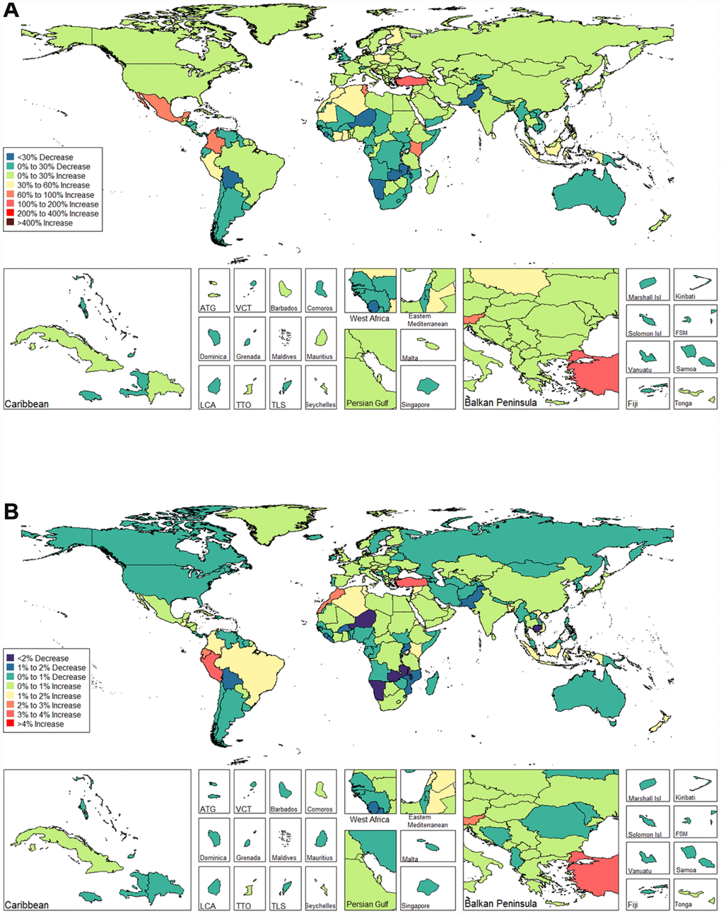 Figure 6. Global disease burden of male infertility prevalence in 195 countries and territories. (A) The percent change in age-standardized prevalence of male infertility between 1990 and 2017; (B) The estimated annual percentage change of male infertility age-standardized prevalence from 1990 to 2017).