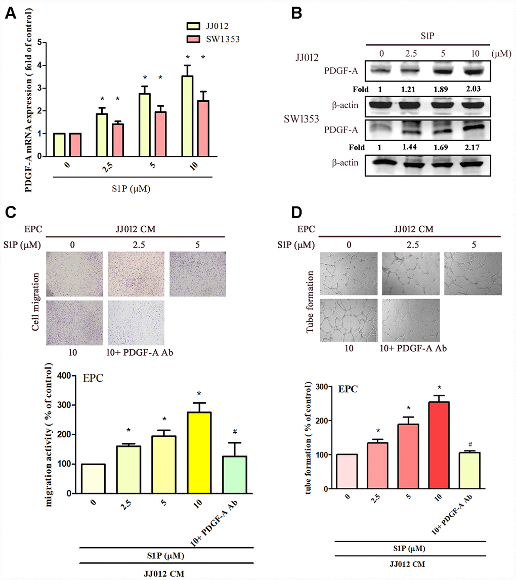 Figure 1. S1P increases PDGF-A expression and angiogenesis in human chondrosarcoma cells. (A, B) Chondrosarcoma cells were incubated with S1P (2.5–10 μM) for 24 h; PDGF-A expression was examined by qPCR and Western blot assays (n=4). (C, D) Chondrosarcoma cells were incubated with S1P for 24 h then stimulated with PDGF-A or IgG antibody (1 μg/ml) for 30 min. The conditioned medium (CM) was then collected and applied to endothelial progenitor cells (EPCs) (n=4). EPC migration and tube formation was measured. Results are expressed as the mean ± SEM. *p < 0.05 as compared with the control group; #p < 0.05 as compared with the S1P-treated group.