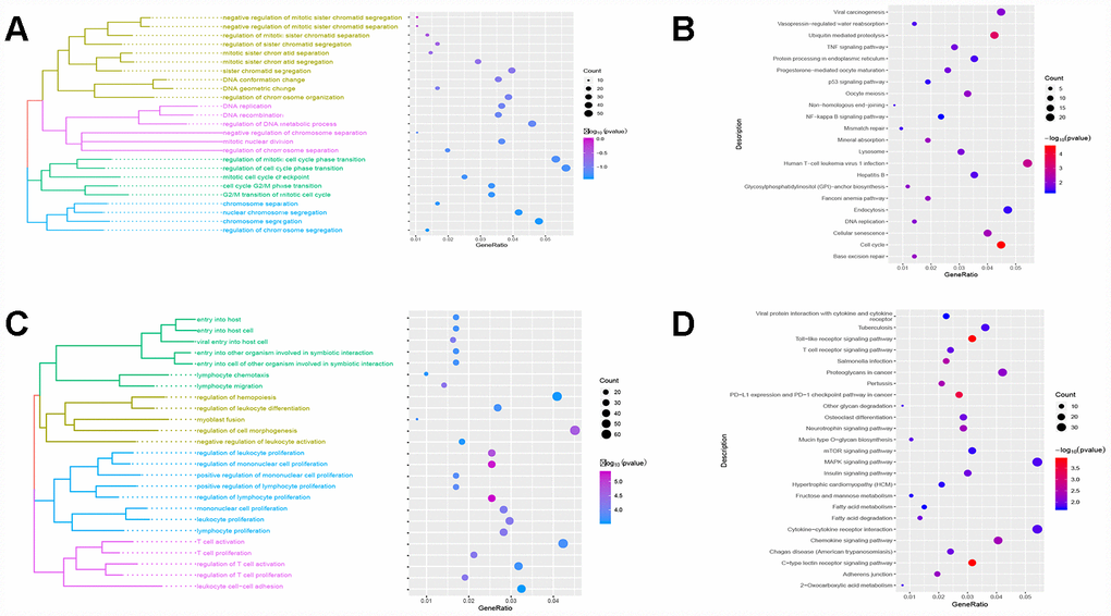 Figure 3. Results of functional enrichment. (A) The red module is significantly enriched in biological processes. (B) The red module is significantly enriched in KEGG pathways. (C) The green module is significantly enriched in biological processes. (D) The green module is significantly enriched in KEGG pathways.