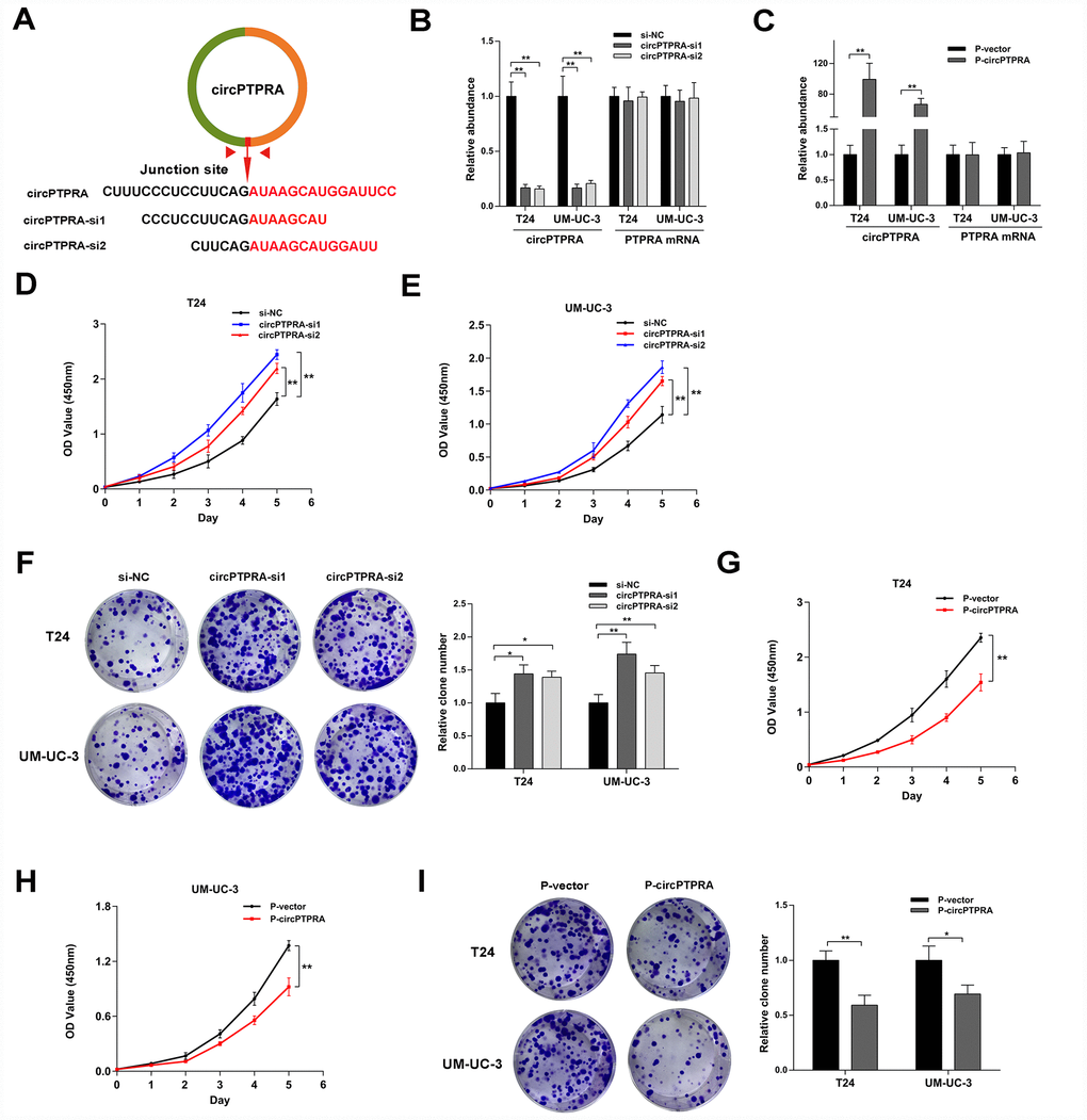 Figure 3. CircPTPRA inhibits the proliferation of BC cells. (A) Design of siRNAs targeting circPTPRA. (B, C) Expression of circPTPRA in BC cell lines after siRNAs treatment and lentivirus transfection. (D–F) Effects of circPTPRA silencing on BC cell proliferation measured through CCK-8 and colony formation assays. (G–I) Effects of circPTPRA overexpression on BC cell proliferation detected by CCK-8 and colony formation assays. Data are presented as the mean ± SD of three experiments. *P< 0.05, **P< 0.01(Student’s t-test).